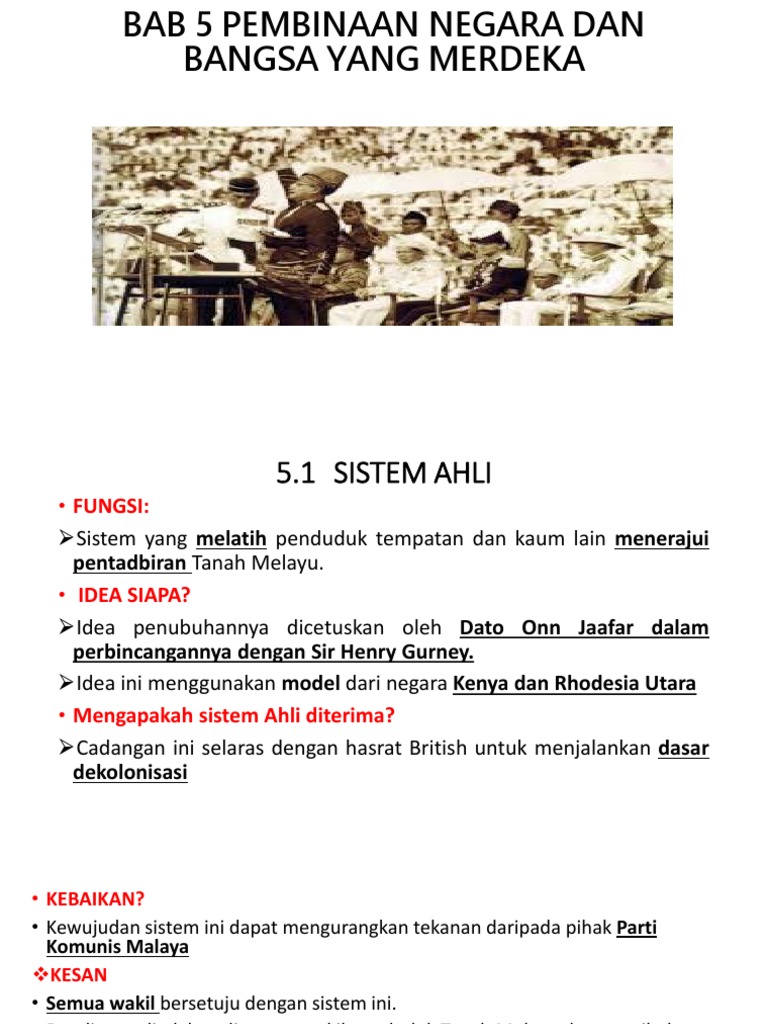 Kesedaran pembinaan negara dan bangsa (merujuk tema 11 huraian sukatan pelajaran dan buku teks sejarah tingkatan 5 bab 3). Kemunculan idea tentang hak rakyat,kerajaan berperlembagaan dan negara bangsa moden. Bagi masyarakat melayu tradisional, negeri bermaksud kawasan. • agama islam dan adat istiadat melayu teras ketuanan bangsa melayu. Memupuk dan memelihara keperibadian kebangsaan yang (d) kemententerian pembangunan negara dan luar bandar ditubuhkan untuk menyelaras projek pembangunan luar bandar.