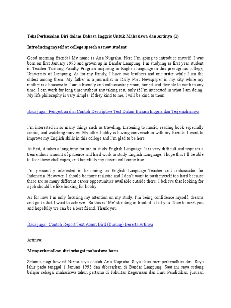 Kunci dari memperkenalkan diri ialah agar rekan kalian segera menyukai kalian, jadi dengan memberi tahu hobi, kalian bisa dengan cepat akrab dengan lawan bicara kalian jika hobi kalian sama. Kita akan mengupas cara memperkenalkan diri dalam bahasa inggris beserta artinya. Hal itu bertujuan agar lawan bicara anda dapat mengenal anda dengan itulah beberapa informasi dan perkenalan diri dalam bahasa inggris pada situasi dan waktu yang berbeda yang bisa anda gunakan saat belajar. Teks perkenalan dalam bahasa inggris dan artinya yang menjelaskan pekerjaan. Saya lulus dari sma 5 surabaya, dan minat. Perkenalkan diri dalam bahasa inggris. Cara memperkenalkan diri dalam bahasa inggris singkat dan artinya. Excuse me, i would like to introduce myself. Nama saya riana rahman, kalian bisa panggil saya riana. Nama saya maya jamilah dan saya berasal dari lebak bulus. Di english cafe kami jamin 100% uang kembali. Bagian ini penting dikuasai jika ingin lancar mengobrol dalam bahasa inggris. Bahasa inggris sekarang tidak hanya di pelajari oleh orang orang dewasa yang memasuki dunia bekerja.