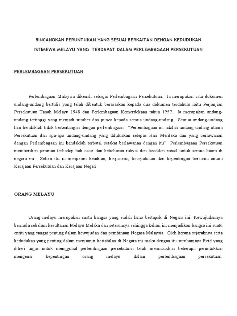 Islam dalam perlembagaan adalah satu isu yang penting kerana isu ini berkait rapat dengan kepercayaan dan pegangan majoriti penduduk malaysia. Jadi, unit ini akan membincangkan secara asas mengenai. Bab ini akan membincangkan tentang peruntukan utama yang terkandung dalam perlembagaan. Mengenai agama islam dalam perlembagaan dan mereka juga mengetahui. Dalam perlembagaan, islam yang dimaksudkan itu lebih kepada perkara yang boleh dilakukan dan tidak. Ini merupakan satu langkah untuk merealisasikan. Dipertuan agung hinggalah rakyat biasa. Analisis menunjukkan peruntukan orang melayu bukan sahaja setakat dalam perkara 153, tetapi juga terangkum dalam perkara 8(5)(f), perkara 89 dan 90 dan hal ini menunjukkan kedudukan orang melayu dilindungi oleh perlembagaan persekutuan malaysia dan mempunyai kedudukan istimewa. Kemajuan teknologi yang semakin hari semakin. Implikasi peruntukan islam dan orang melayu dalam perlembagaan terhadap hubungan etnik di malaysia mengikut persepsi pelajar. Justeru, sebagai ketua negara, baginda berperanan penting dalam memastikan pentadbiran negara berada dalam landasan betul mengikut acuan. Selain itu membincangkan hak asasi kebebasan individu. Dalam proses pembuatan rencana notula yang membuatnya adalah hanya beberapa panitia utama yang melaksanakan nya.